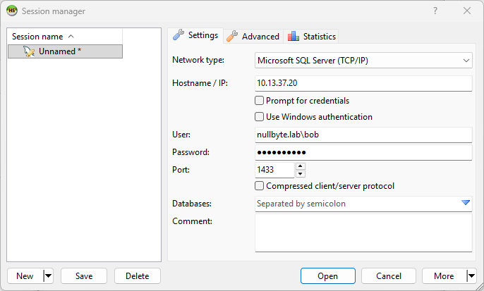 We log on to the SQL01 machine with the compromised domain user ‘Bob’ using the HeidiSQL client:
