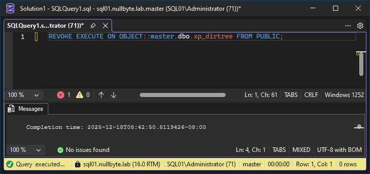 The example below shows how to revoke xp_dirtree execution privileges from accounts (these are both SQL or domain accounts) other than database admins using the following query: