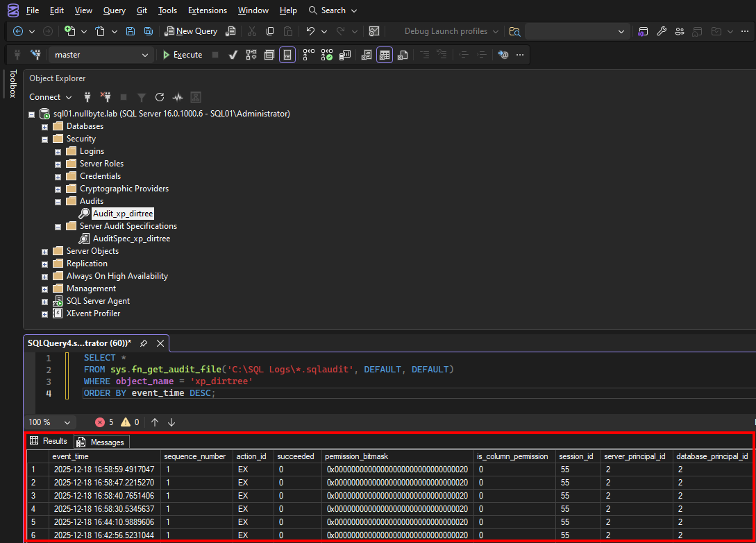 The image below shows the configured audit log and a query that filters the generated log files on xp_dirtree: